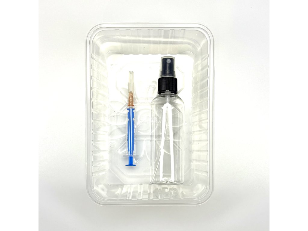 Pomocí ní lze v případě potřeby vpíchnout tekutinu do exempláře, pokud je stále příliš tuhý. Pokud se exemplář dostatečně navlhčil už v boxu, stříkačku není nutné použít.