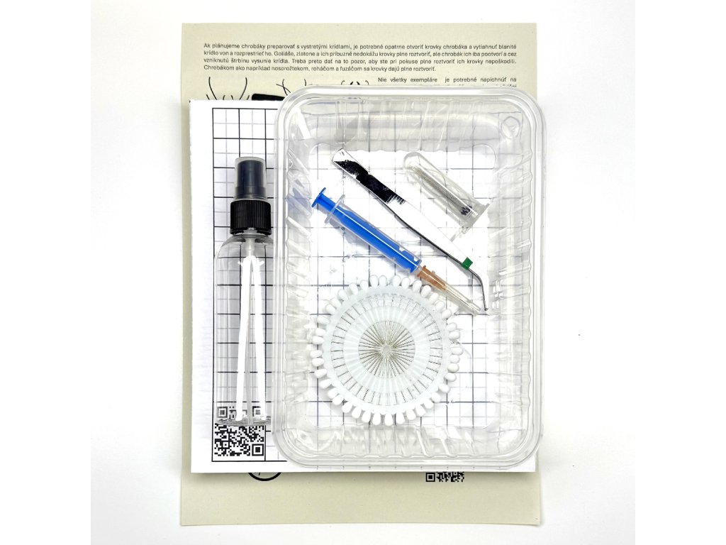 Sada je vhodná také pro školáky nebo mládež se zájmem o entomologii a hmyz. Dodáváme ji jako kompletní set se vším potřebným k preparaci – od vlhčení až po samotnou preparaci. Díky plastovému boxu a rozprašovači pohodlně navlhčíte exemplář, který následně na měkké desce pomocí špendlíků upravíte do požadované polohy. Pomoci si můžete přiloženou pinzetou.