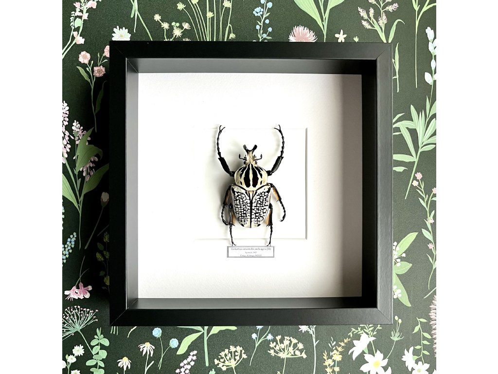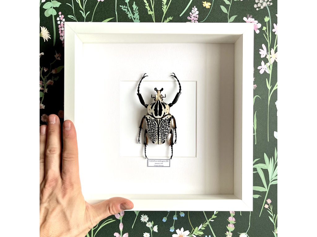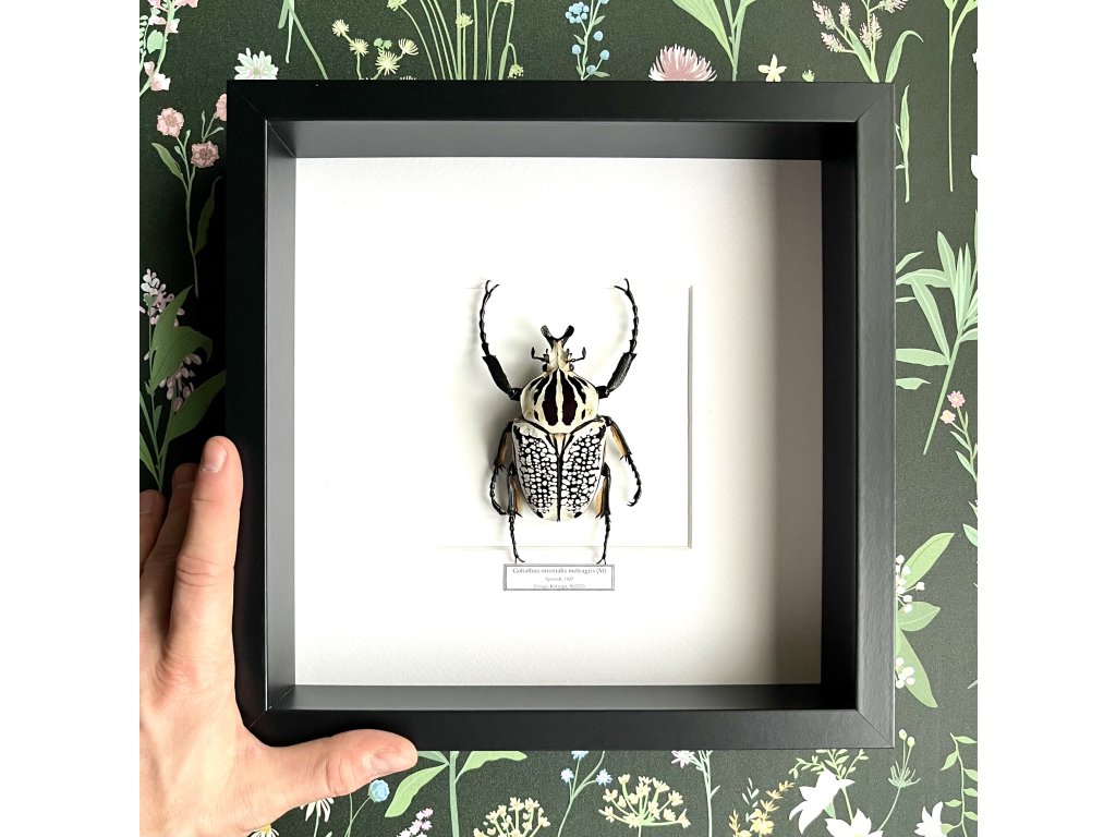 Zarámovaný Goliathus meleagris patří mezi nejznámější a největší brouky Afriky. Tento exemplář je zpracován bez rozevřených křídel, aby vynikl jeho typický tvar těla a nádherný kontrastní vzor na krovkách, který připomíná mozaiku.