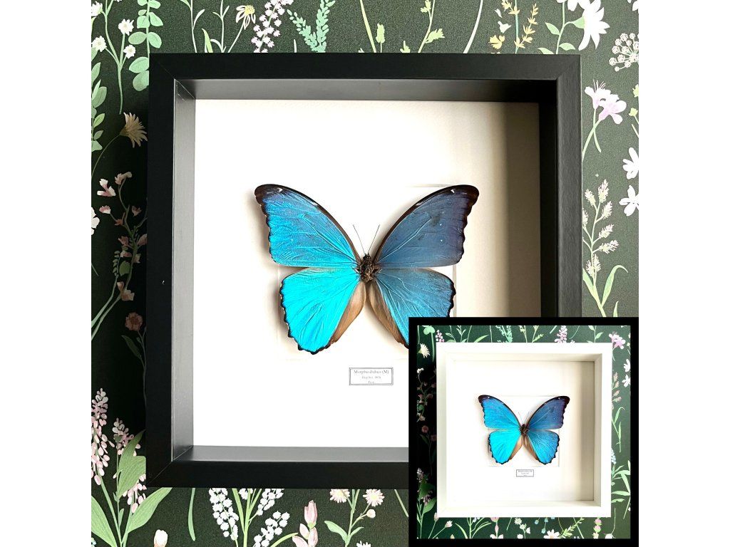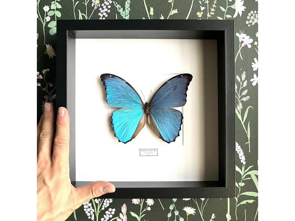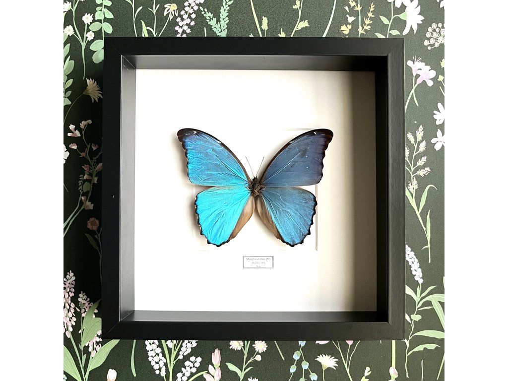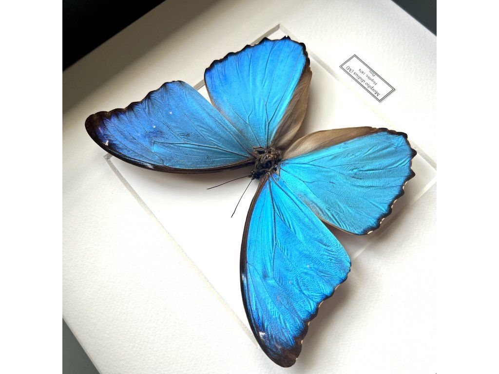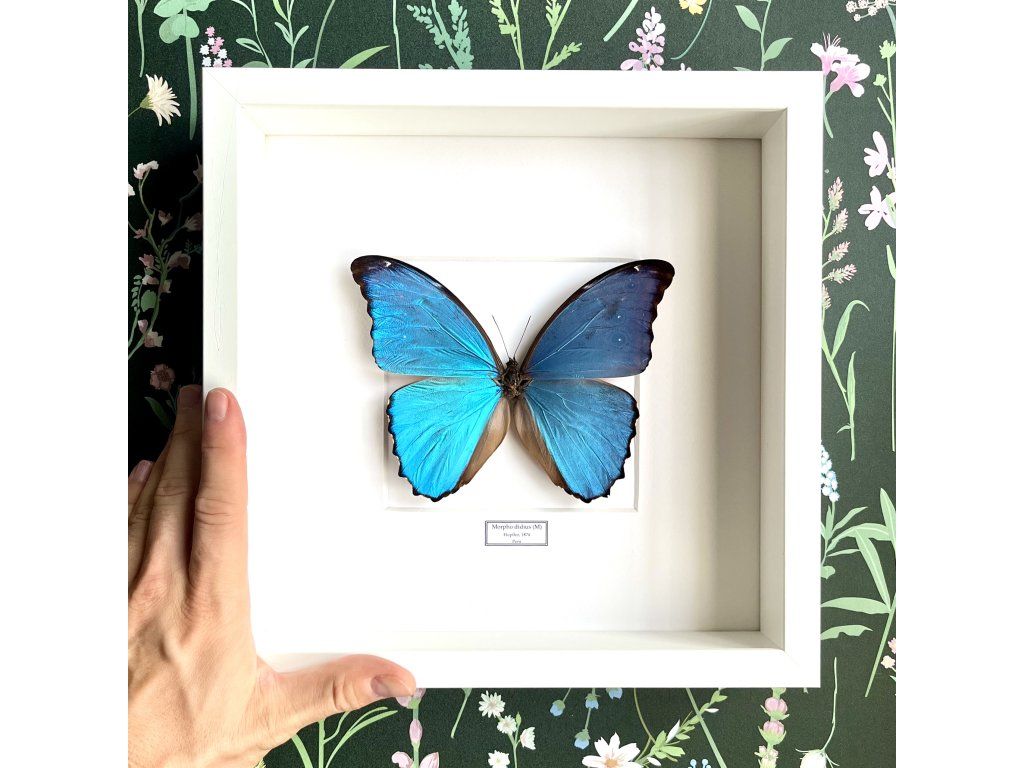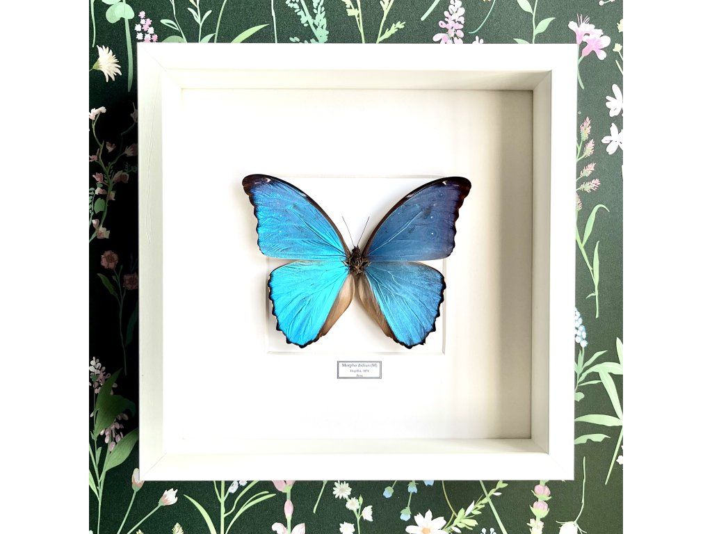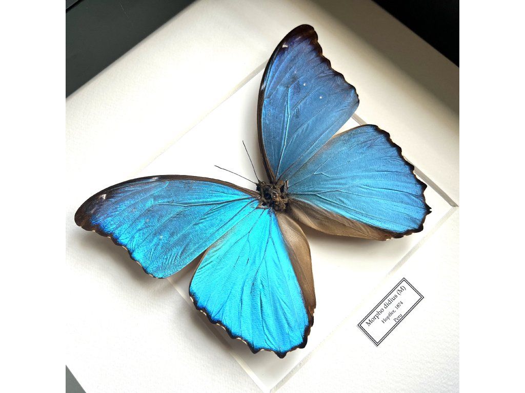 Zarámovaný motýl Morpho didius patří mezi nejvýraznější tropické druhy motýlů. Pochází z deštných pralesů Jižní Ameriky a je známý svou intenzivní, metalicky modrou barvou křídel, která se při dopadu světla nádherně rozzáří.