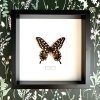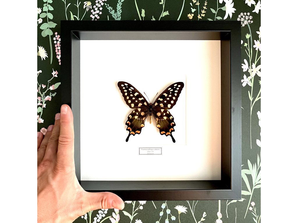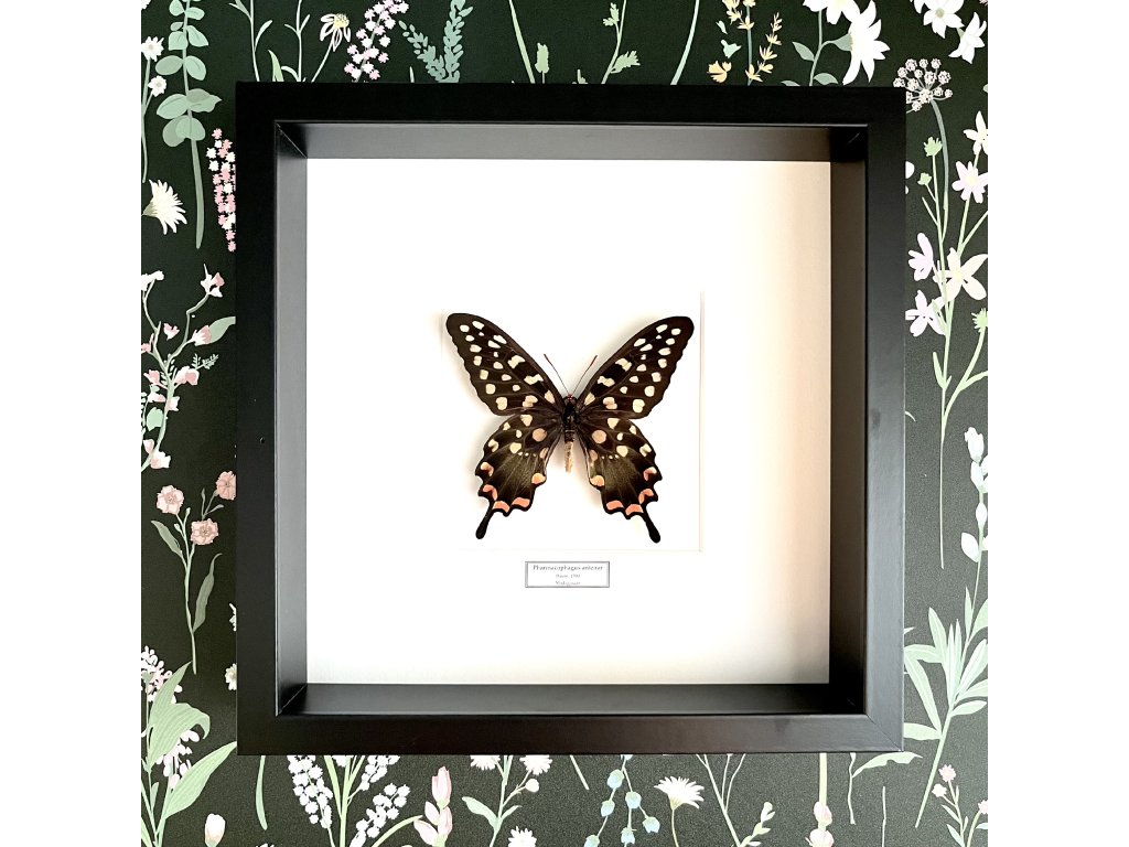 Tento nádherný madagaskarský motýl, Pharmacophagus antenor, okouzluje svou jedinečnou kombinací černé, bílé a červené barvy. Jeho elegantní křídla a výrazné kontrasty z něj dělají výjimečný kousek pro sběratele i dekorativní účely. Pečlivě zarámovaný, tento motýl přinese exotický nádech do každého interiéru. Pro sběratele představuje vzácný a velmi cenný exemplář hmyzího světa.