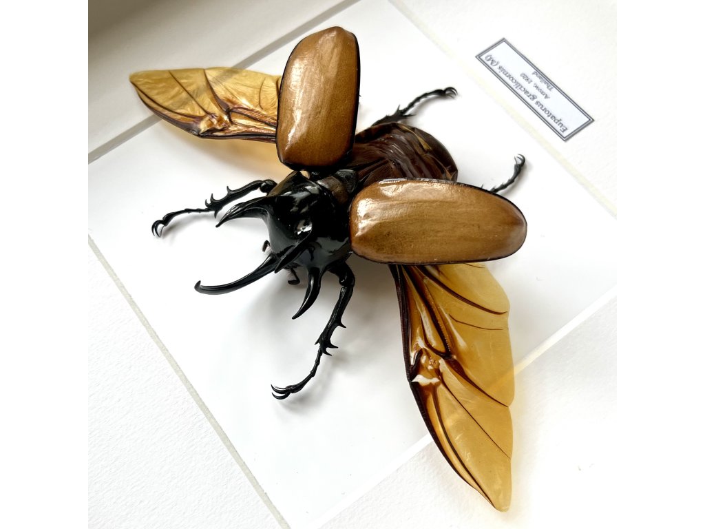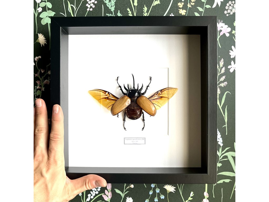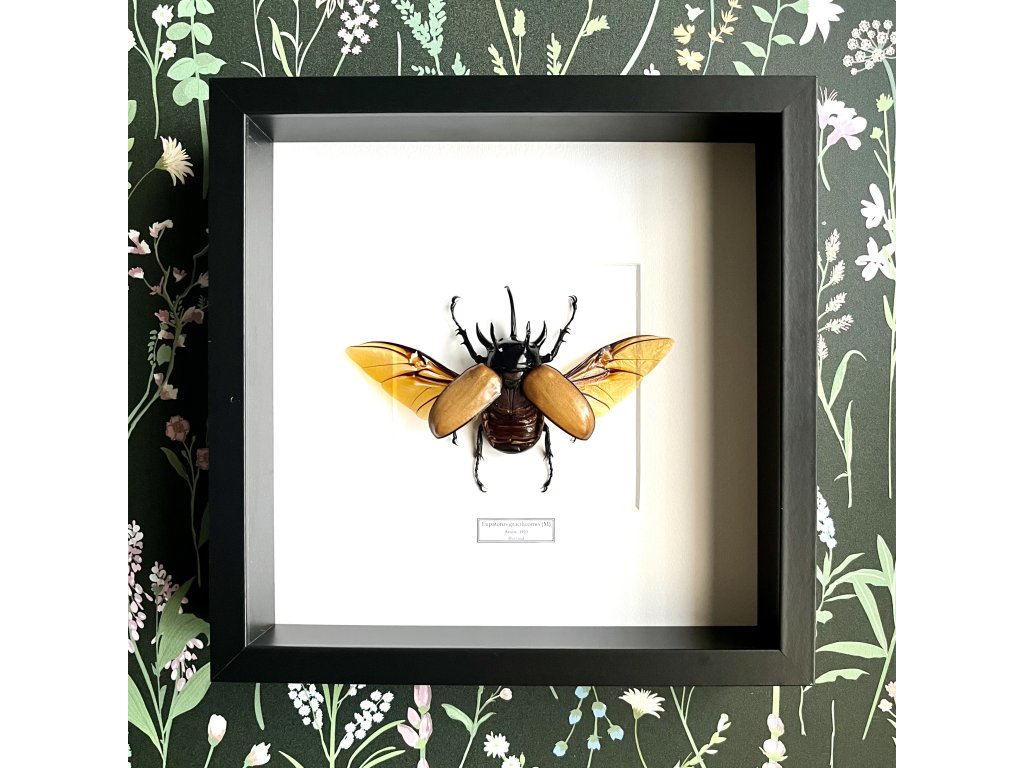 Obdivujte impozantního pětihrotého brouka Eupatorus gracilicornis s roztaženými křídly v letové poloze. Tento ohromující exemplář z tropických oblastí jihovýchodní Asie je detailně vypreparovaný a zasazený do kvalitního dřevěného rámu s ochranným sklem, což z něj činí výjimečný doplněk pro interiér. Ideální pro sběratele, milovníky přírody nebo jako fascinující dekorace.